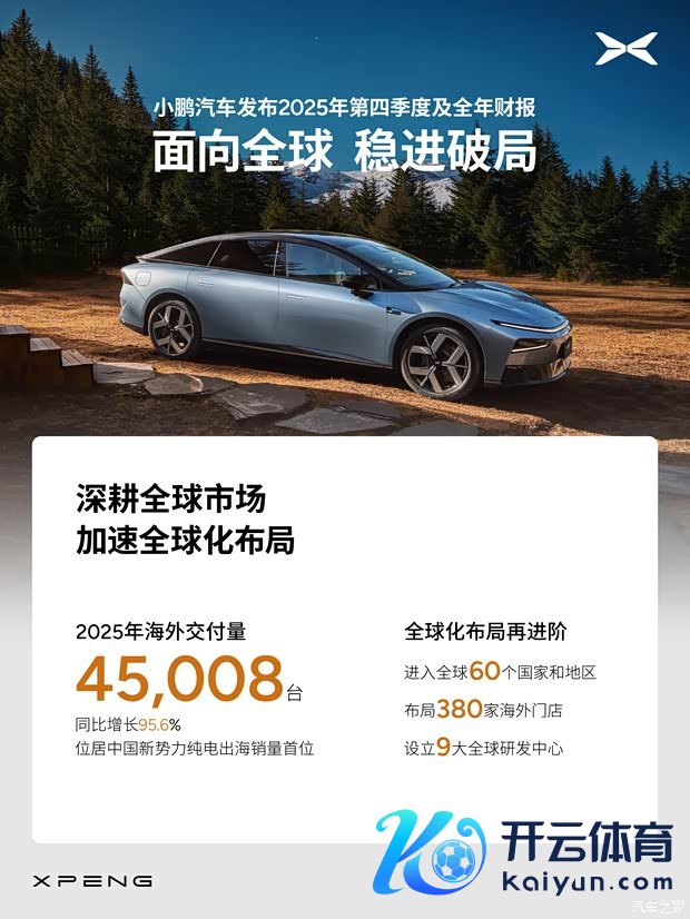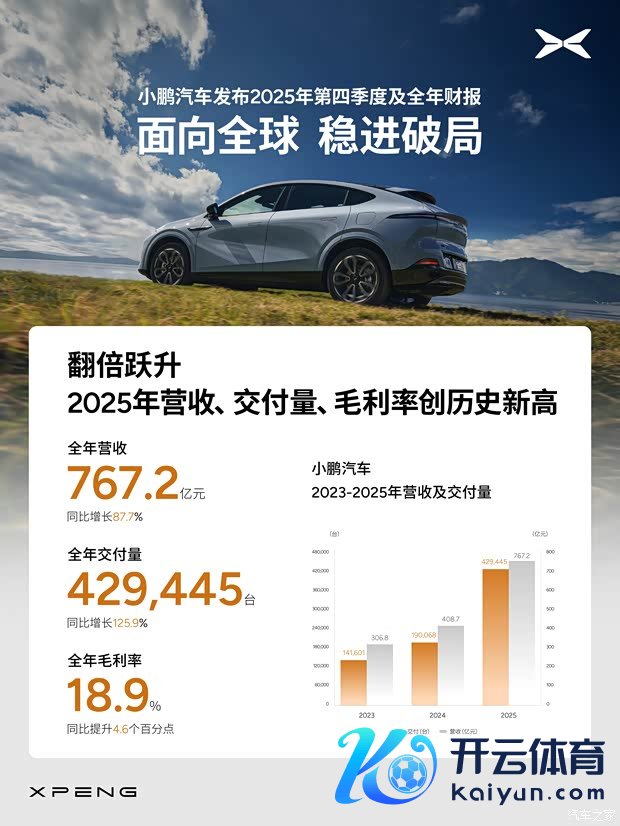 2025年全年总营收767.2亿元,同比增长87.7%;全年毛利率达18.9%,同比普及4.6个百分点;全年委派量达429445台,同比增长125.9%;全年研发支拨达94.9亿元,同比增长47.0%。2025年小鹏汽车国际委派量45008台,同比增长95.6%云开体育,当今如故投入群众60个国度和地区。(编译/汽车之家 秦超)