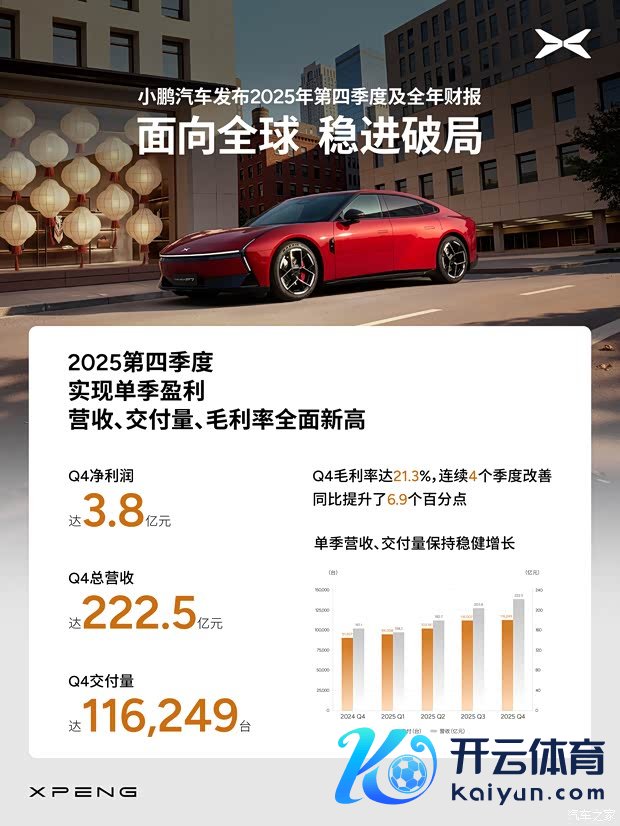 [汽车之家 资讯] 日前,小鹏汽车发布2025年第四季度及2025年全年财报,2025年四季度小鹏汽车总委派116249台,同比增长27%;营收达222.5亿元,同比增长38.2%;净利润达3.8亿元,竣事单季度盈利;毛利率达21.3%,同比普及6.9个百分点。铁心2025年12月31日,现款及现款等价物、受适度现款、短期投资及按期入款为东说念主民币476.6亿元,相较2024年同时增多约57亿元。